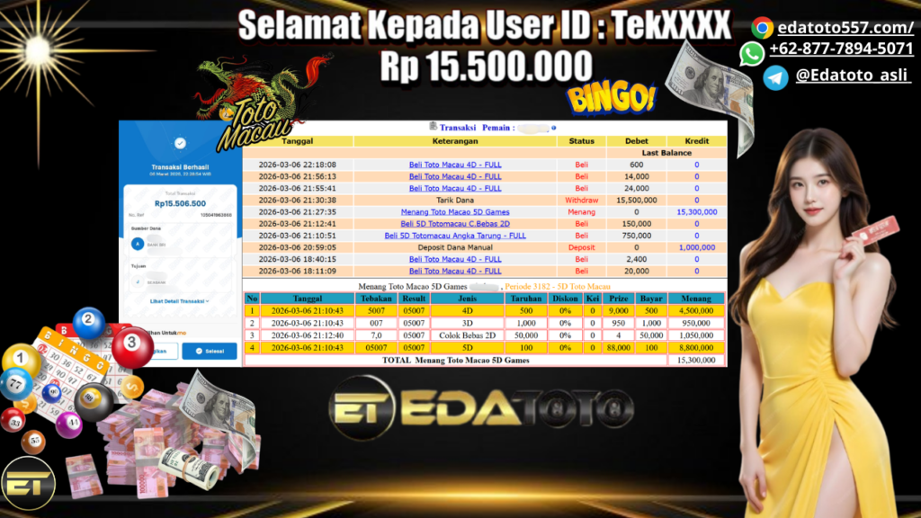 Selamat kepada member setia EDATOTO telah mendapatkan JP Bermain Di : Menang Toto Macao 5D Games