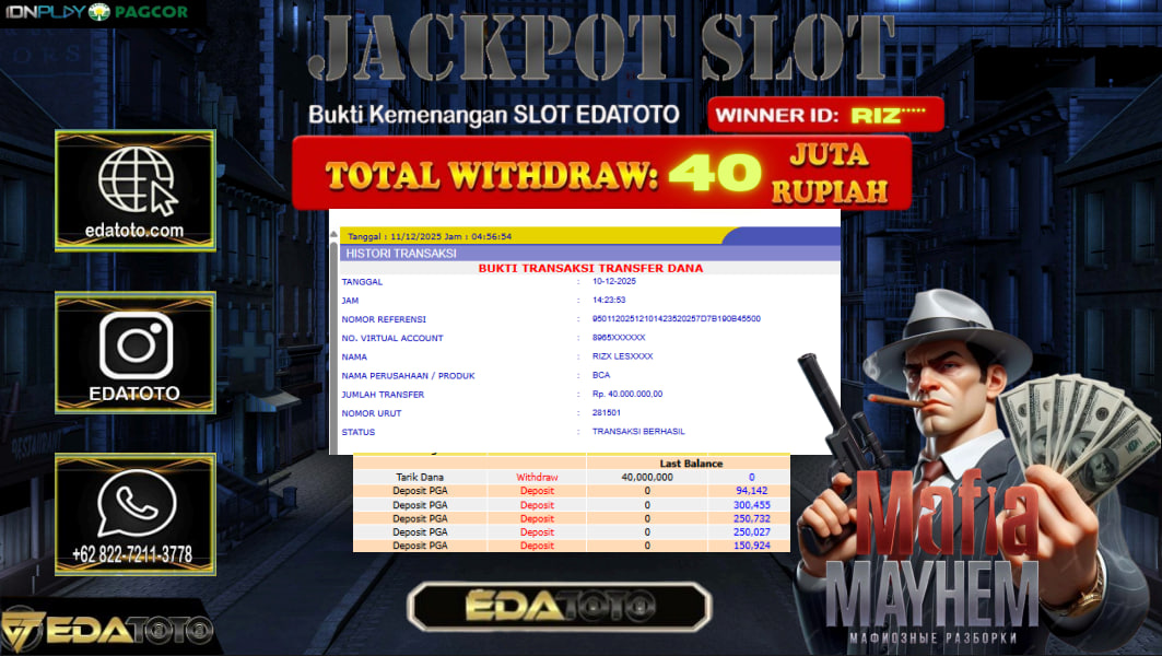 Selamat Kepada Pemilik user ID : RIZ*** Hari/Tanggal :RABU/ 10, Desember 2025 Jackpot : Rp. 40,025,000 JT Withdraw :40,000,000 JT . . .