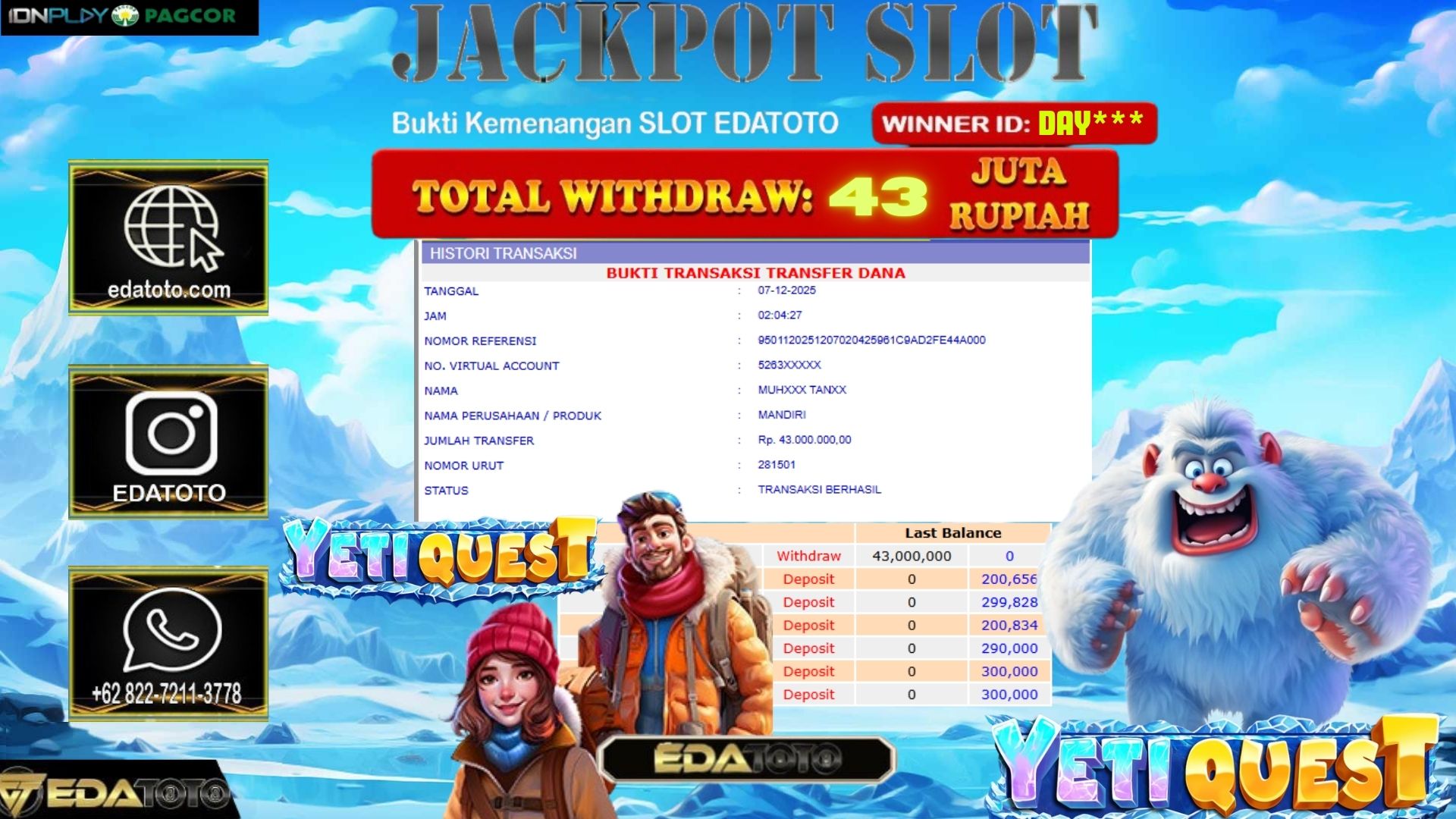 Selamat Kepada Pemilik user ID : DAY*** Hari/Tanggal :MINGGU/ 7, Desember 2025 Jackpot : Rp. 43,500,000 JT Withdraw :43,000,000 JT . . .