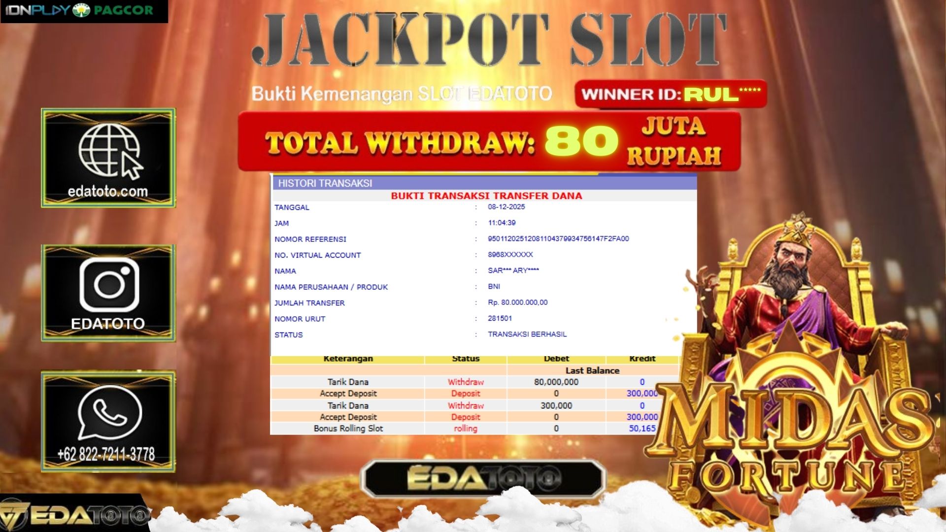 Selamat Kepada Pemilik user ID : RUL*** Hari/Tanggal :SENIN/ 8, Desember 2025 Jackpot : Rp. 80,000,000 JT Withdraw :80,000,000 JT . . .