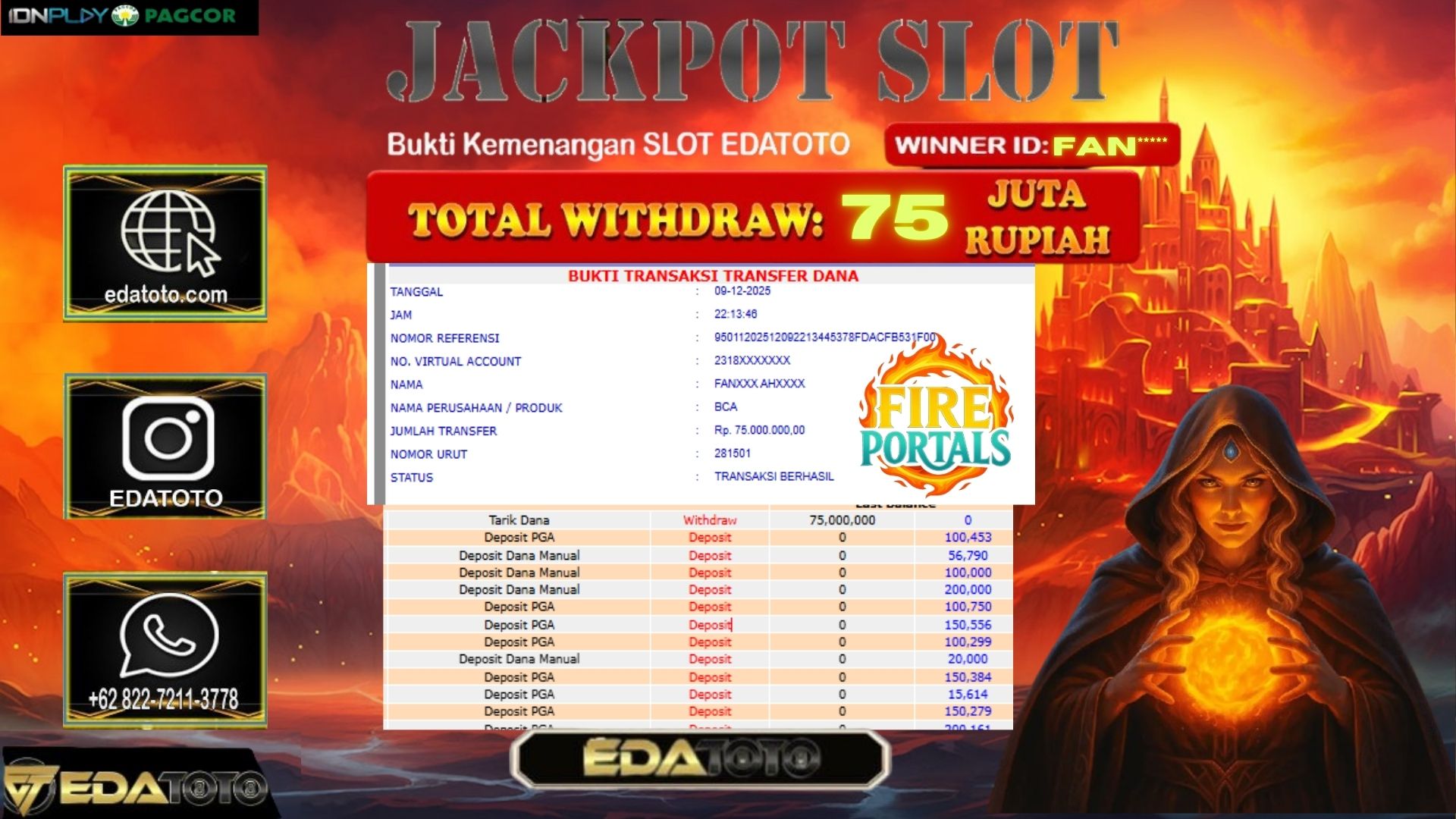 Selamat Kepada Pemilik user ID : FAN*** Hari/Tanggal :SELASA/ 9, Desember 2025 Jackpot : Rp. 75,825,000 JT Withdraw :75,000,000 JT . . .