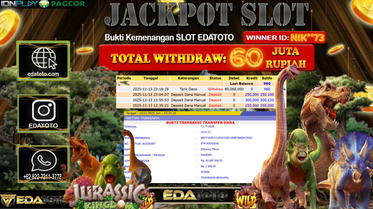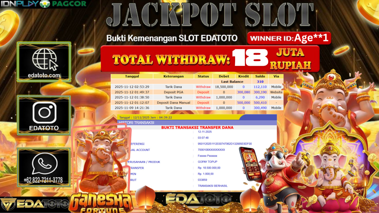 Selamat Kepada Pemilik user ID :Age**1 Hari/Tanggal : Senin / 10, November 2025 Jackpot : Rp. 17,000,000 JT Withdraw :18,500,000 . . .