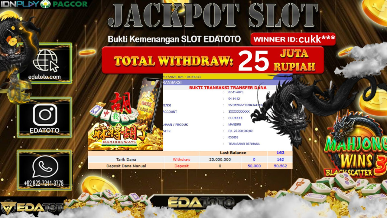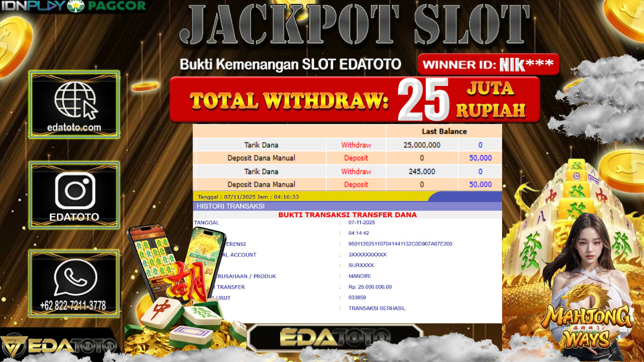 Selamat Kepada Pemilik user ID : Nik*** Hari/Tanggal : RABU / 5, November 2025 Jackpot : Rp. 25,000,000 JT Withdraw :25,000,000 . . .