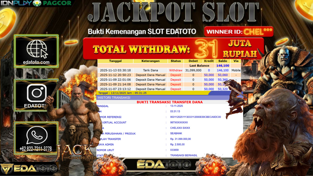 Selamat Kepada Pemilik user ID : CHEL*** Hari/Tanggal : Selasa / 11, November 2025 Jackpot : Rp. 32,800,000 JT Withdraw :31,100,000 . . .