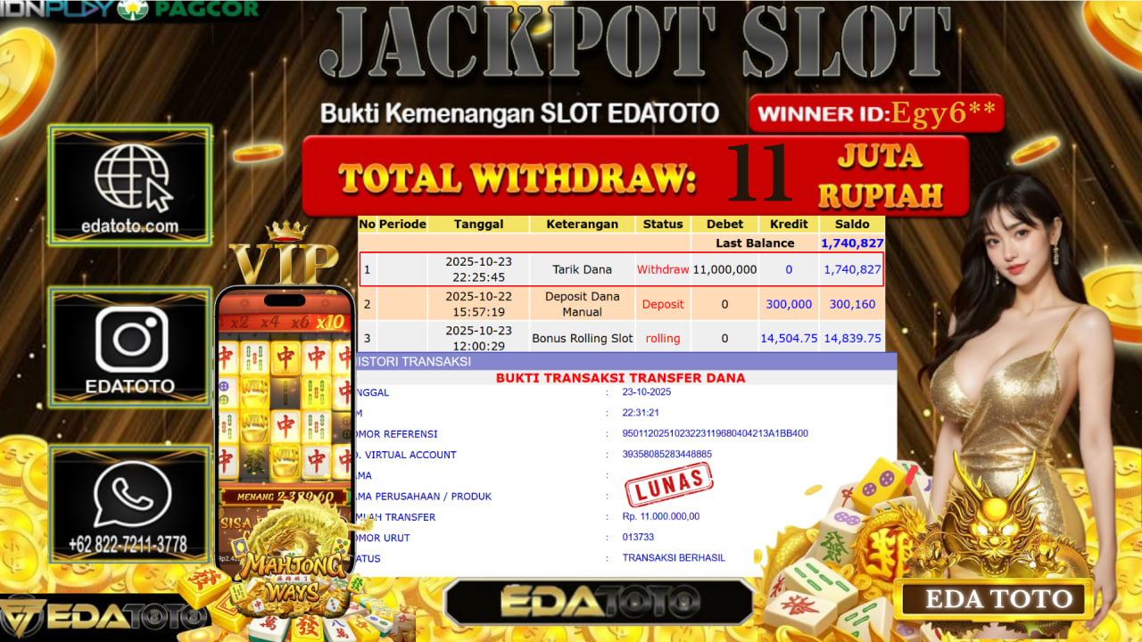 Selamat Kepada Pemilik user ID : Egy6** Hari/Tanggal : Sabtu / 25, Oktober 2025 Jackpot : Rp. 11.000.000 JT Permainan . . .