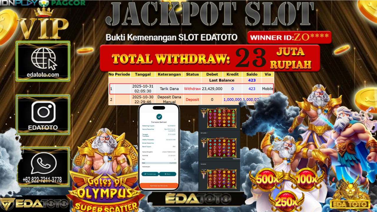 Selamat Kepada Pemilik user ID : ZO**** Hari/Tanggal : Jumat / 31, Oktober 2025 Jackpot : Rp. 23.000.000 JT Permainan : Gates Of . . .