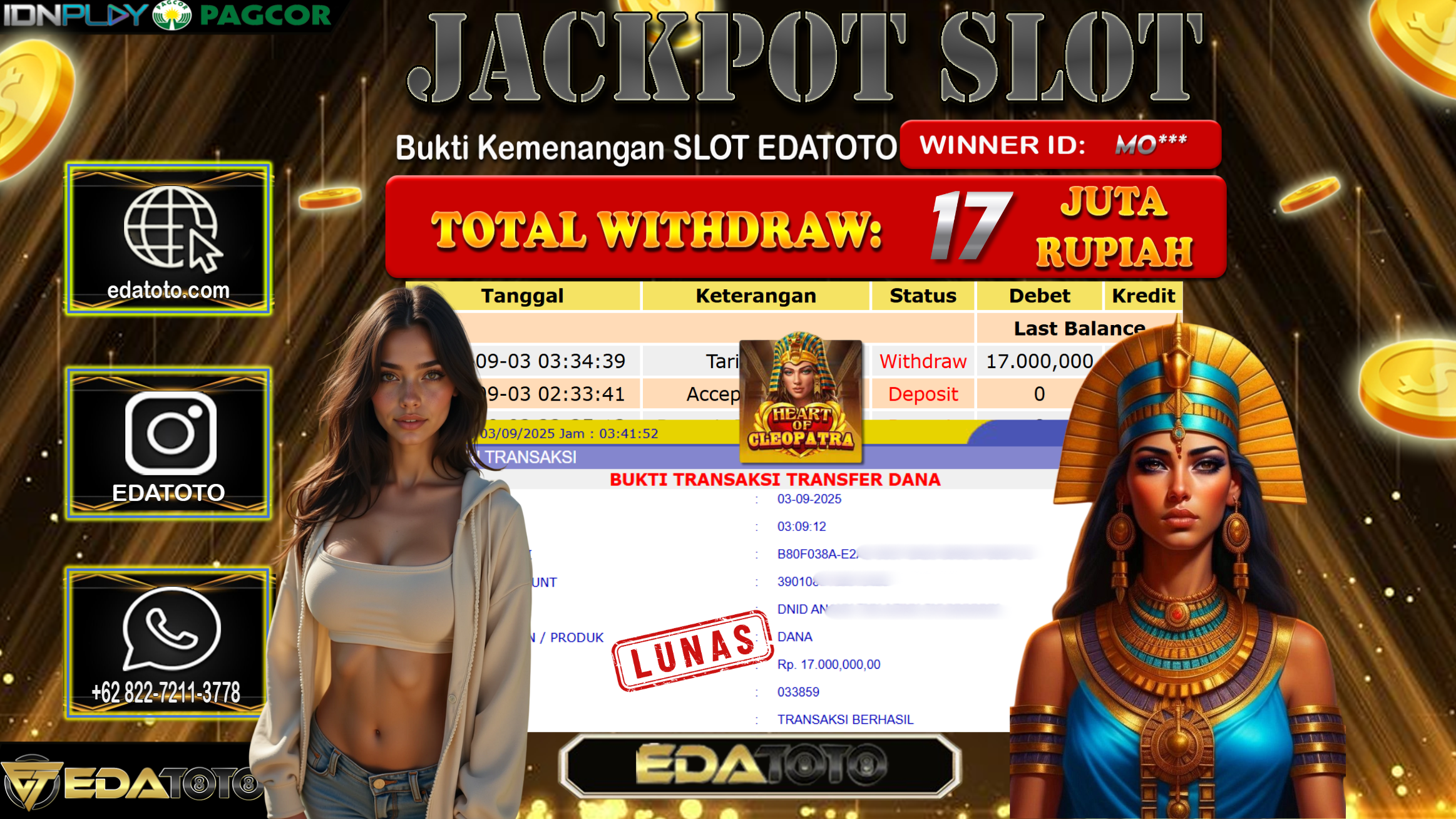 Selamat Kepada Pemilik user ID : Mo*** Hari/Tanggal : Rabu/ 3, September 2025 Jackpot : Rp. 17.000.000 JT Permainan : . . .