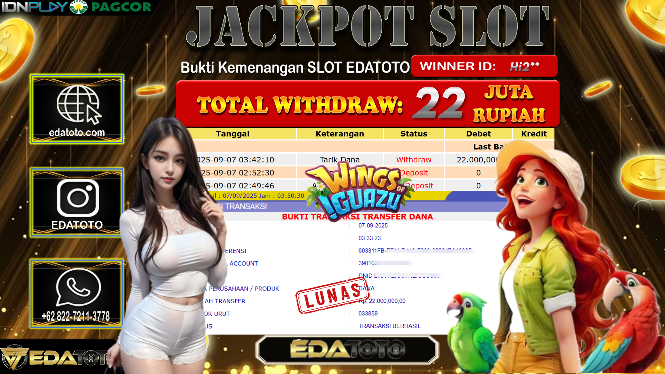 Selamat Kepada Pemilik user ID : Hi2*** Hari/Tanggal : Minggu/ 7, September 2025 Jackpot : Rp. 22.000.000 JT Permainan : . . .