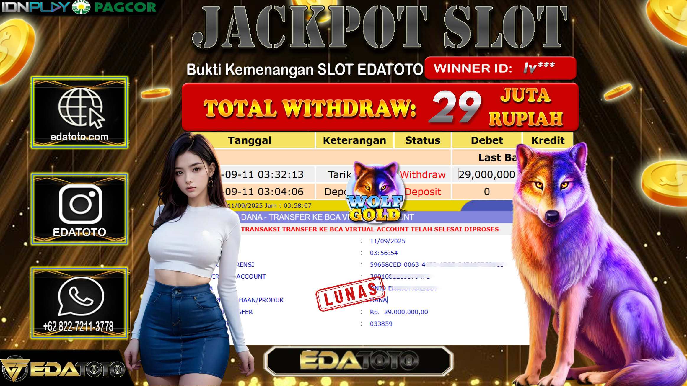 Selamat Kepada Pemilik user ID : Iv*** Hari/Tanggal : Kamis/ 11, September 2025 Jackpot : Rp. 29.000.000 JT Permainan : . . .