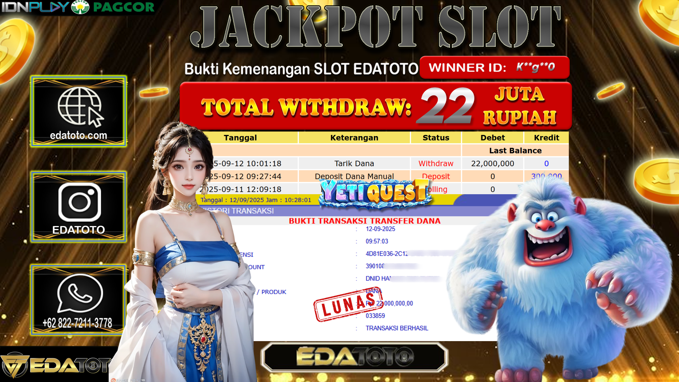 Selamat Kepada Pemilik user ID : K**g**0 Hari/Tanggal : Jumat/ 12, September 2025 Jackpot : Rp. 22.000.000 JT Permainan : . . .