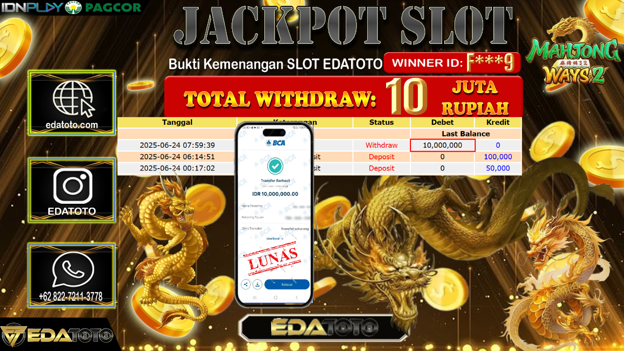 Selamat Kepada Pemilik user ID : F***9 Hari/Tanggal : Selasa/ 24, Juni 2025 Jackpot : Rp. 10.000.000 JT Permainan : Mahjong . . .