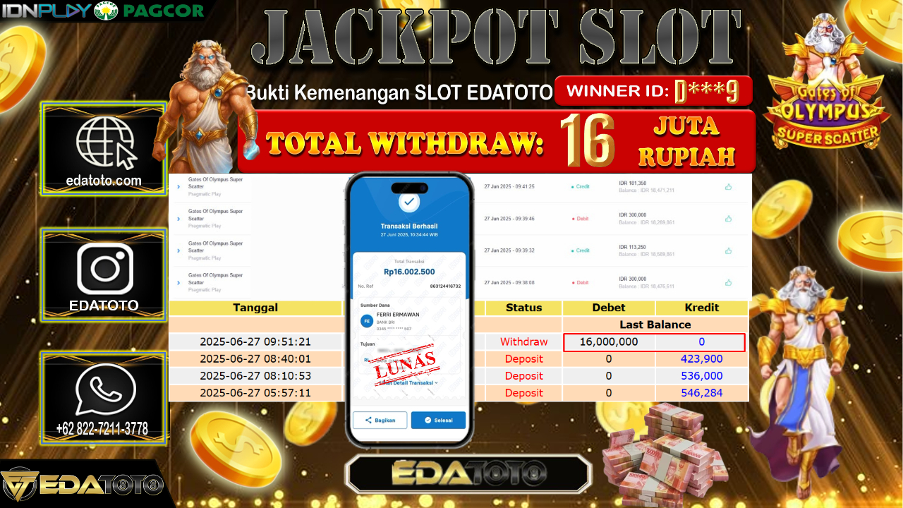 Selamat Kepada Pemilik user ID : D***9 Hari/Tanggal : Sabtu/ 28, Juni 2025 Jackpot : Rp. 16.000.000 JT Permainan : Gates . . .