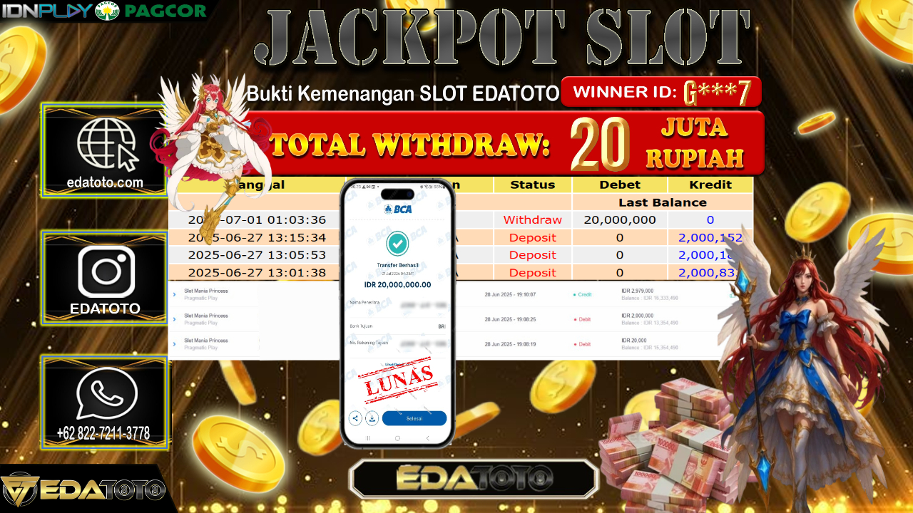 Selamat Kepada Pemilik user ID : G***7 Hari/Tanggal : Selasa/ 01, Juli 2025 Jackpot : Rp. 20.000.000 JT Permainan : . . .