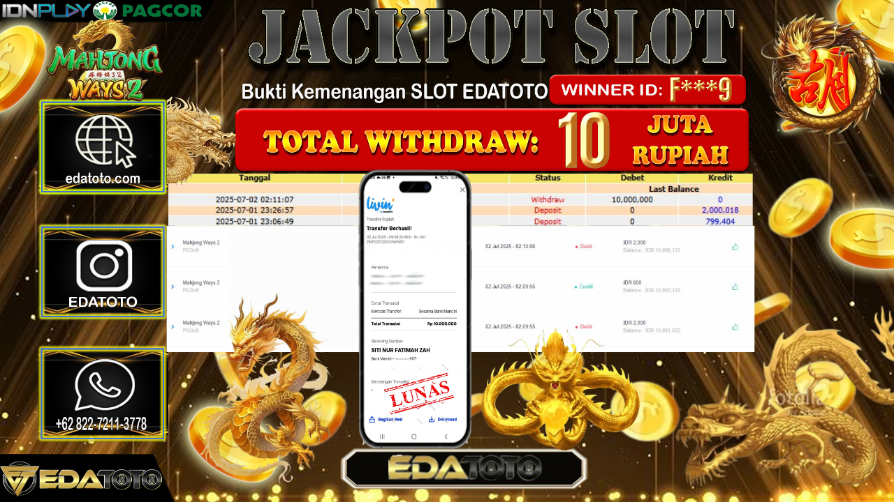 Selamat Kepada Pemilik user ID : F***9 Hari/Tanggal : Rabu/ 02, Juli 2025 Jackpot : Rp. 10.000.000 JT Permainan : . . .
