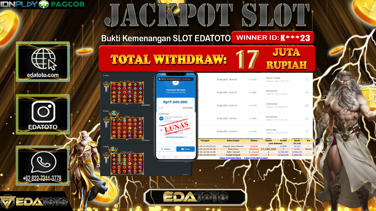 Selamat Kepada Pemilik user ID : K***23 Hari/Tanggal : Jumat/ 25 , April 2025 Jackpot : Rp. 17.000.000 JT Permainan . . .