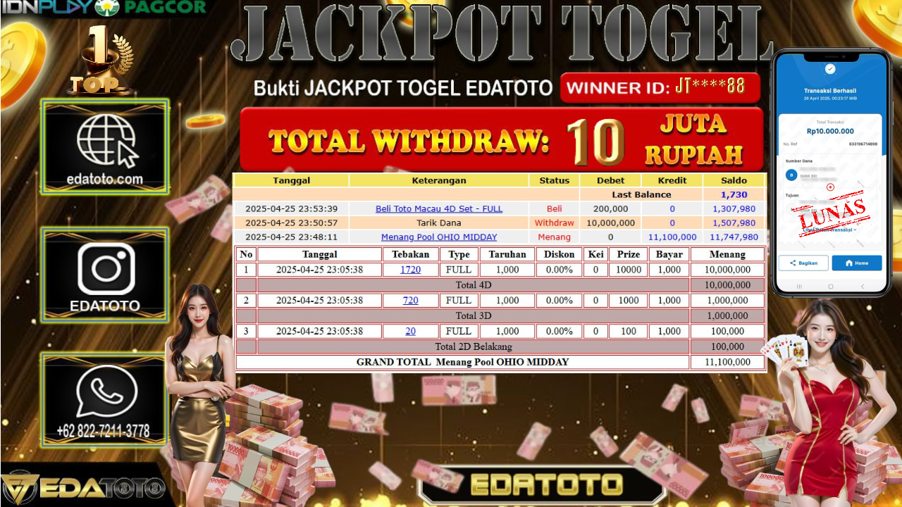 Selamat Kepada Pemilik user ID : EG****T Hari/Tanggal : Rabu/ 23 , April 2025 Jackpot : Rp. 10.000.000 JT Permainan : . . .