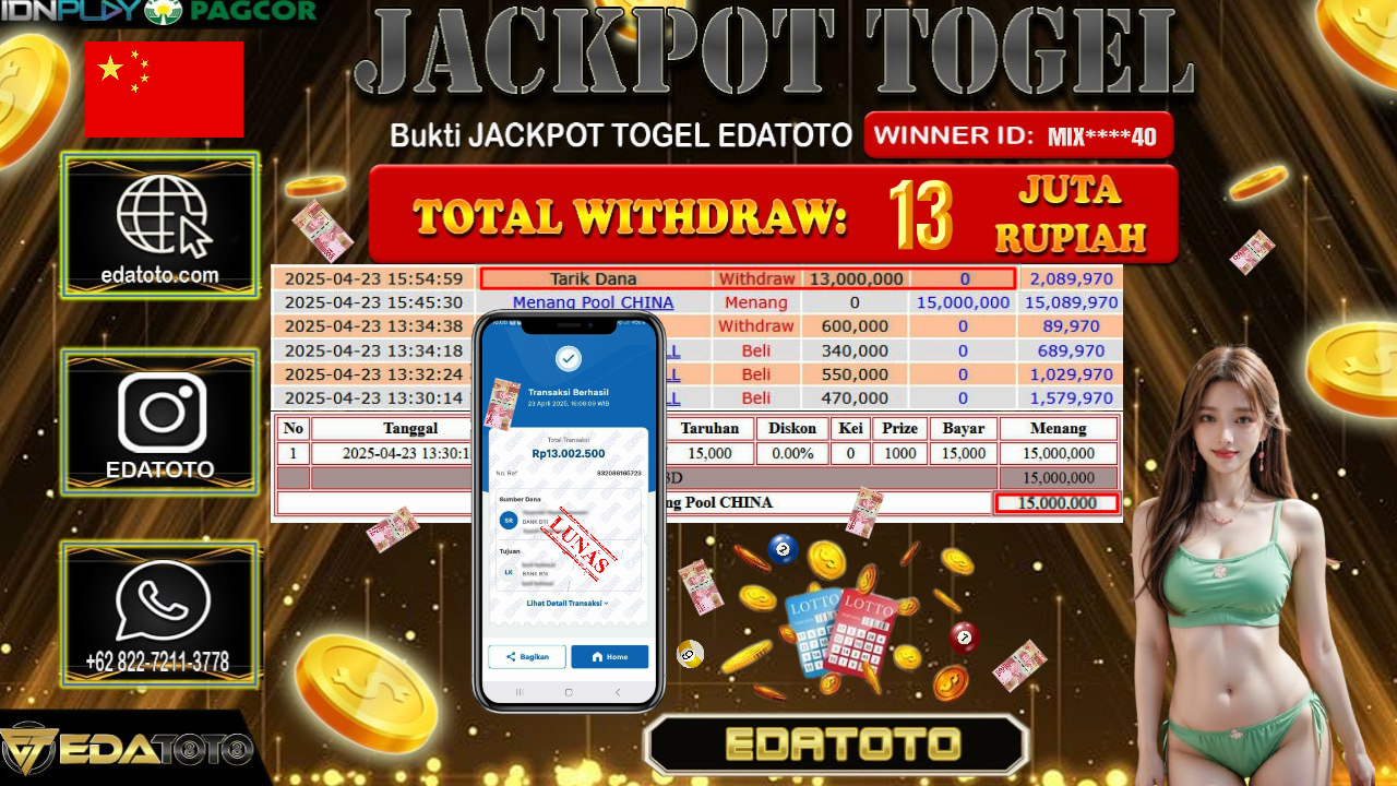 Selamat Kepada Pemilik user ID : MIX****40 Hari/Tanggal : Jumat/ 25 , April 2025 Jackpot : Rp. 13.000.000 JT Permainan : . . .
