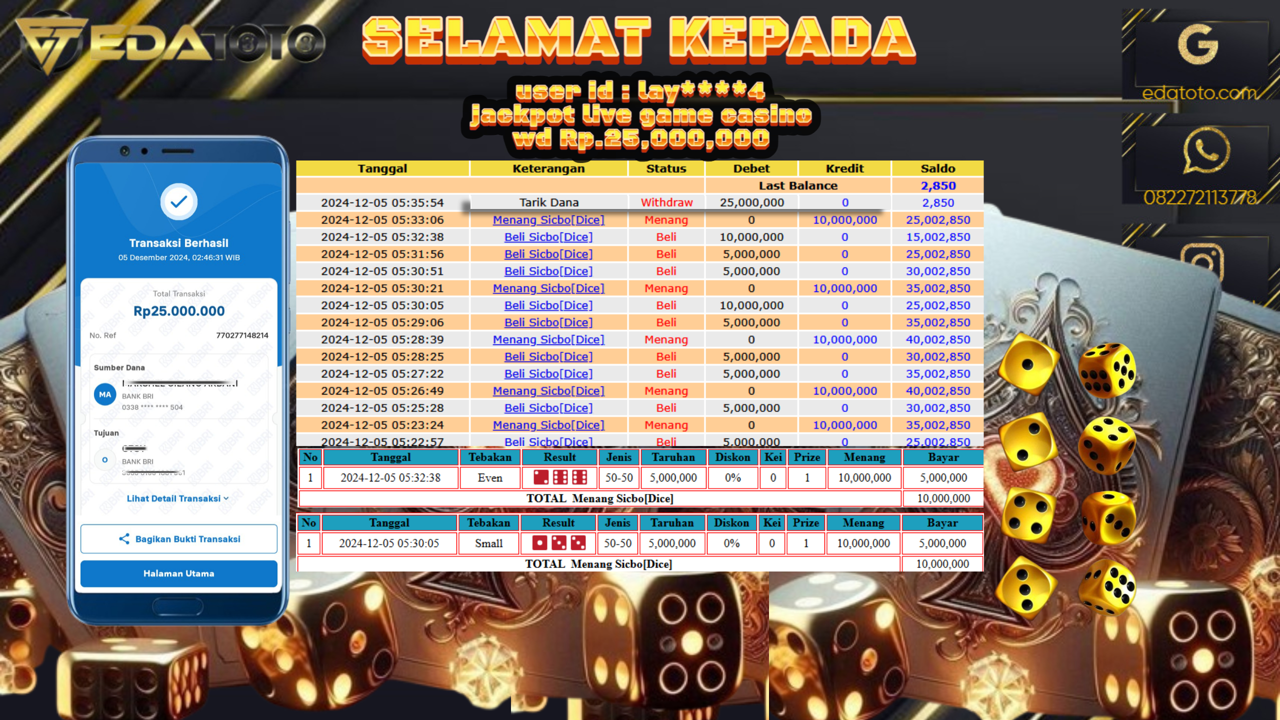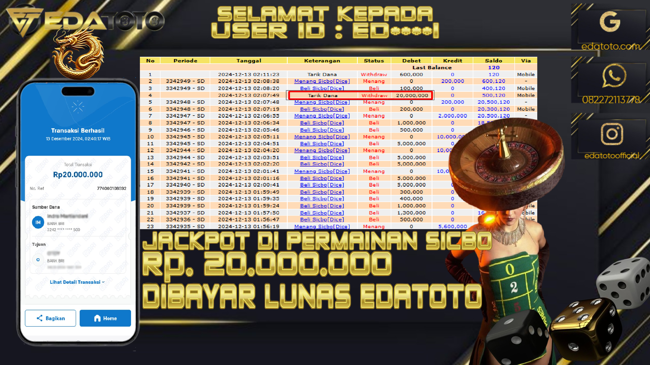 Selamat Kepada Pemilik user ID : ED*****I Hari/Tanggal : Jumat/ 12 DESEMBER 2024 Jackpot : Rp. 20.000.000 JT Permainan : . . .