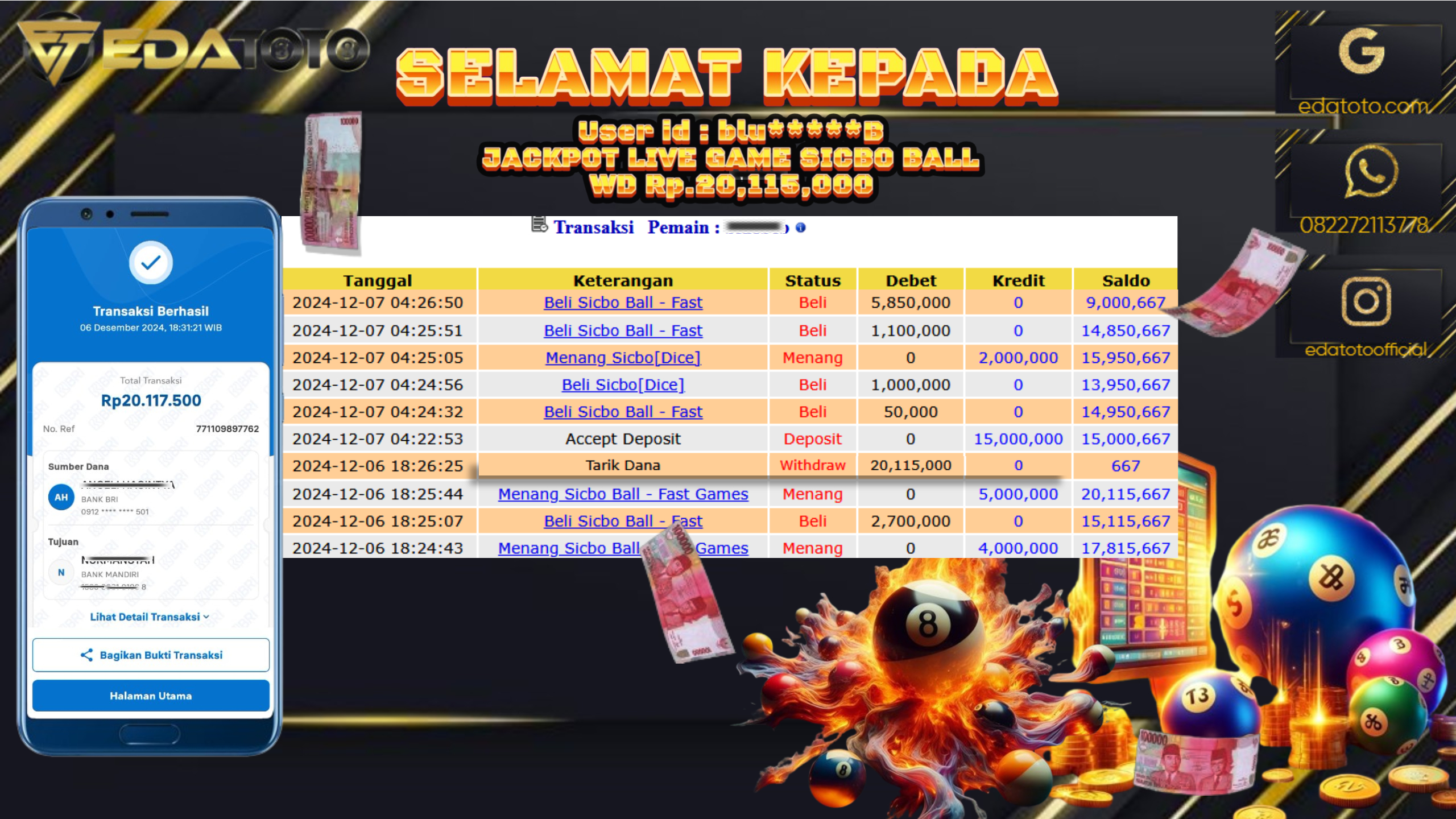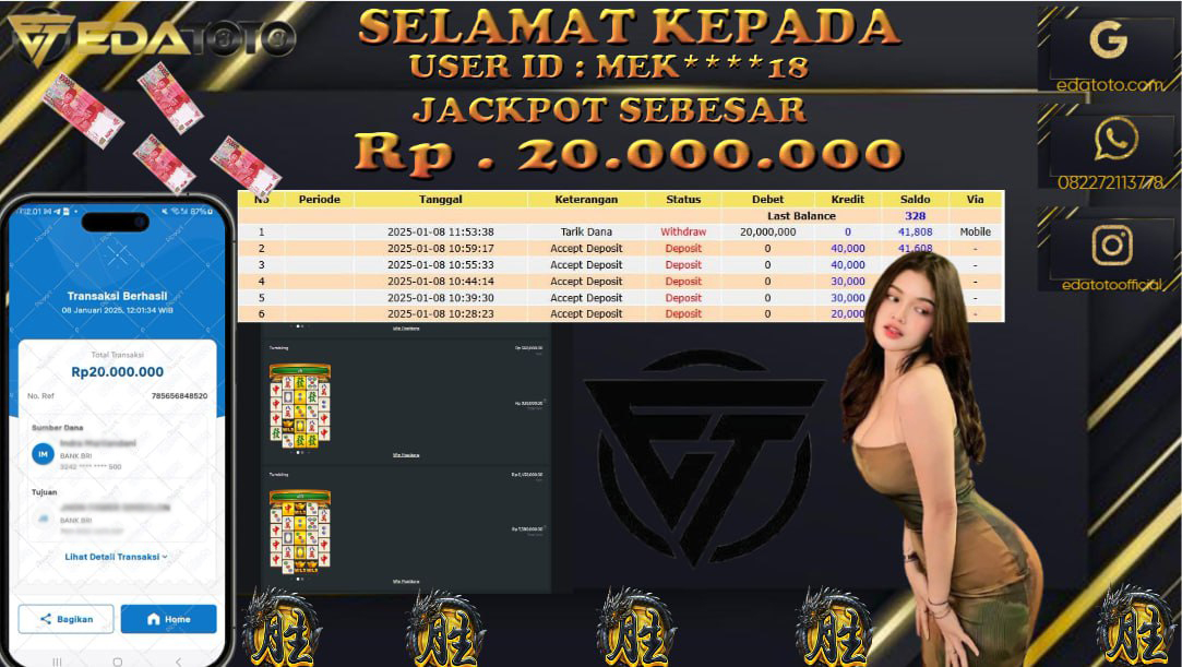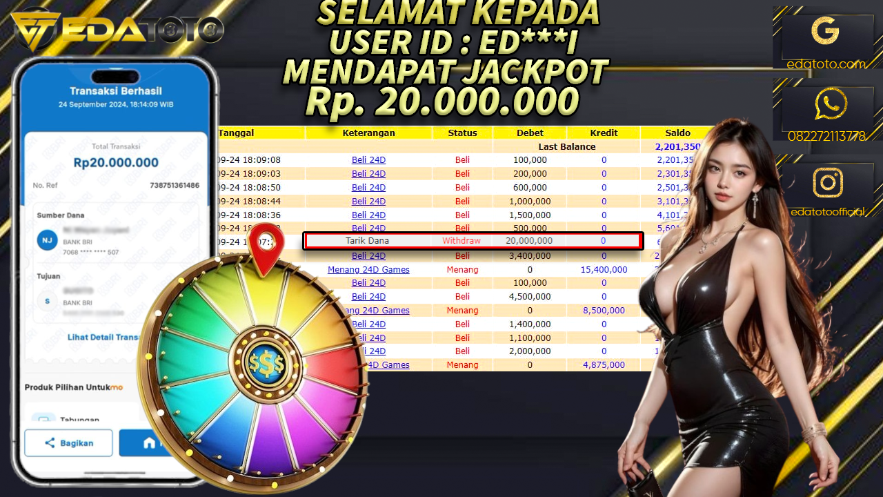 Selamat Kepada Pemilik user ID : ED*****I Hari/Tanggal : Jumat/ 12 DESEMBER 2024 Jackpot : Rp. 20.000.000 JT Permainan . . .
