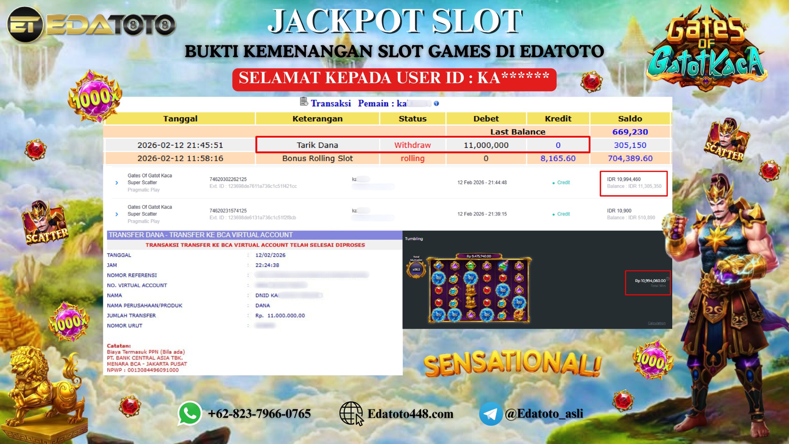 Selamat Kepada Pemilik user ID : KA****** Hari/Tanggal : Kamis/ 12 februari 2026 Jackpot : Rp.10,994,000 JT Withdraw : 11,000,000 . . .