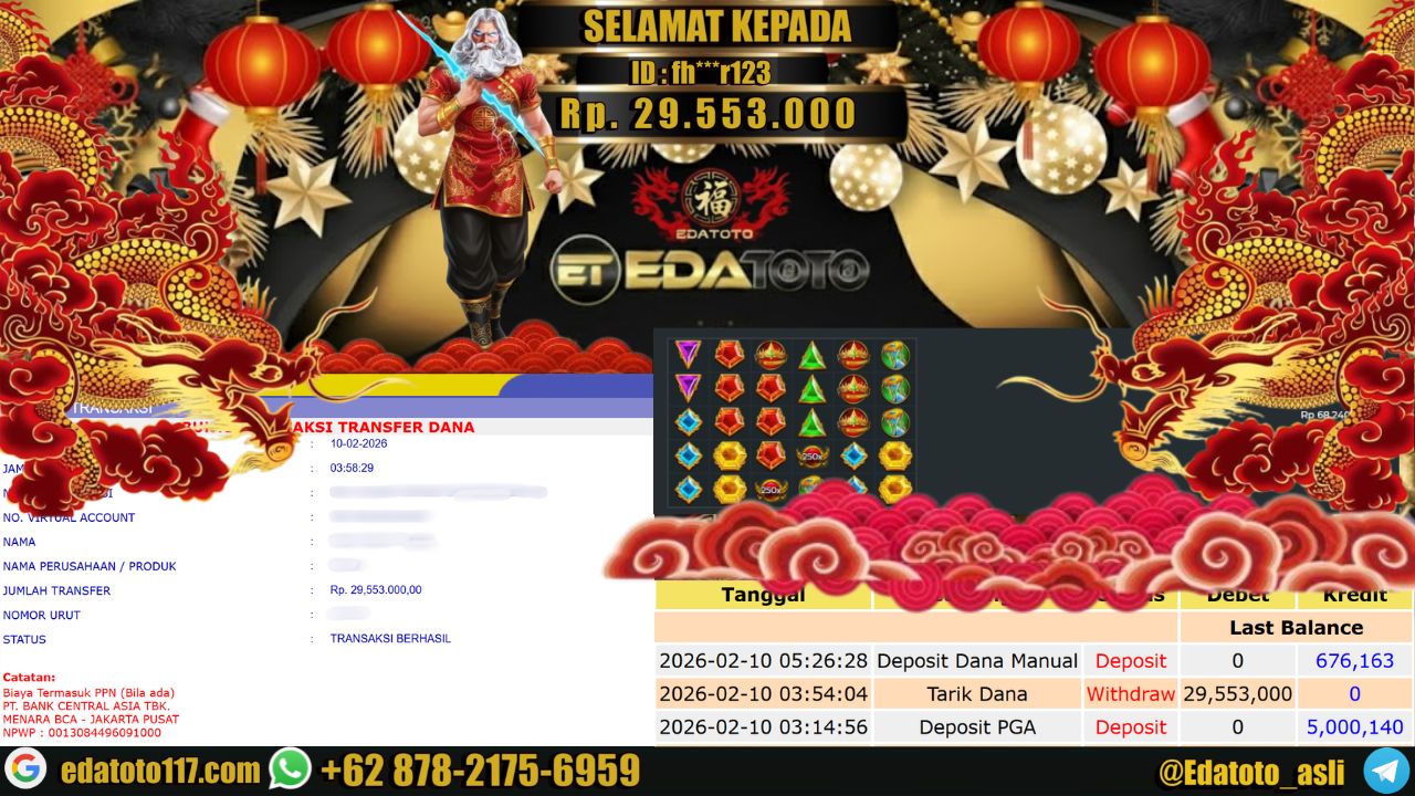 Selamat Kepada Pemilik user ID : fh***r123 Hari/Tanggal : Selasa / 10 februari 2026 Jackpot : Rp. 30,500,000 JT Withdraw . . .