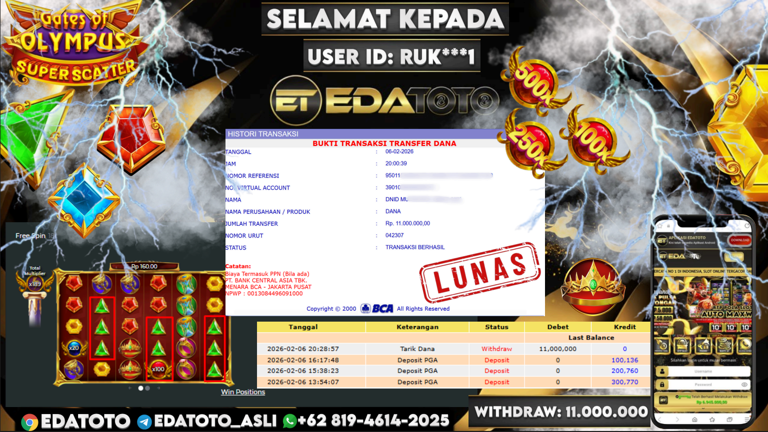 Selamat Kepada Pemilik user ID : RUK***1 Hari/Tanggal :Jumat/ 06 februari 2026 Jackpot : Rp. 11,000,000 JT Withdraw : . . .
