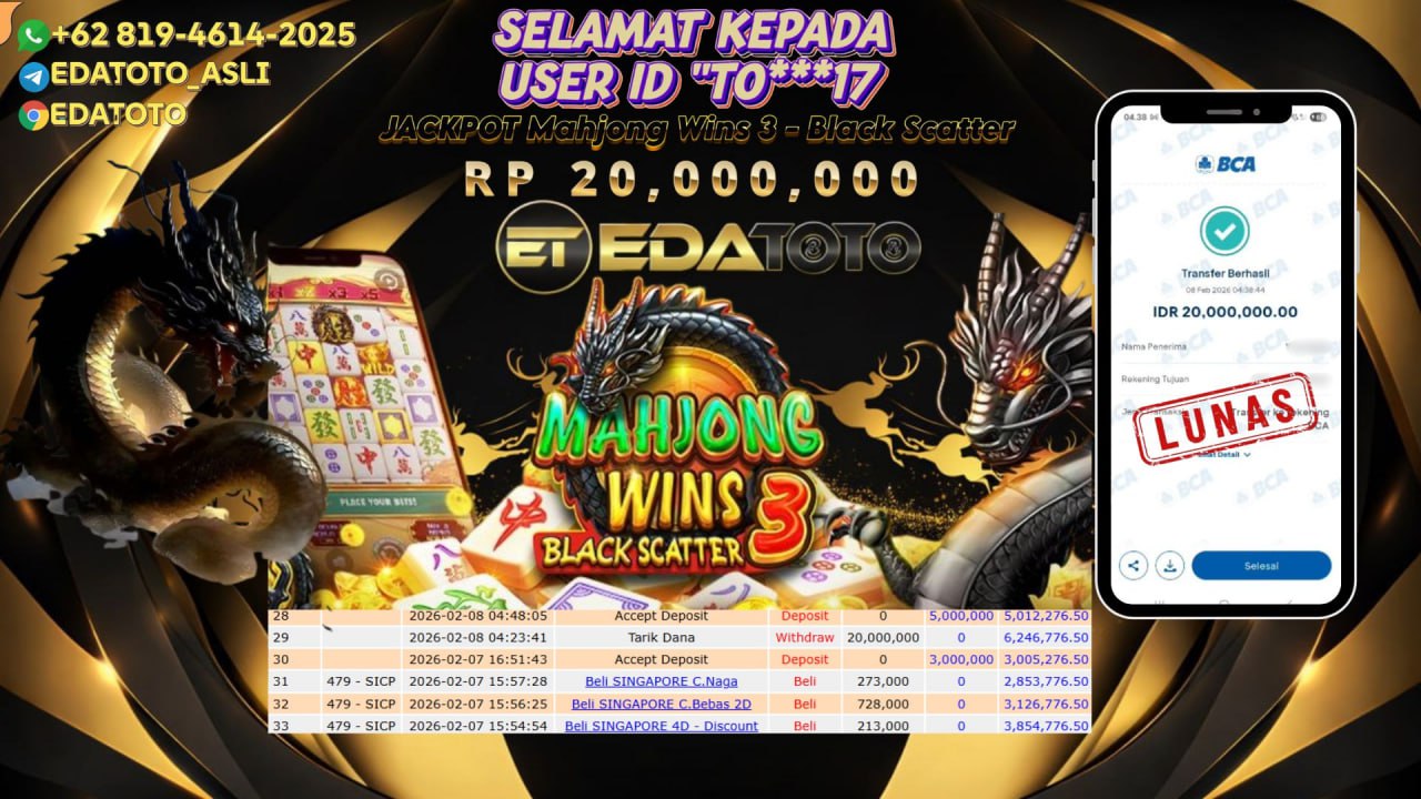 Selamat Kepada Pemilik user ID : TO***17 Hari/Tanggal :Sabtu/ 08 februari 2026 Jackpot : Rp. 20,000,000 JT Withdraw : 20,000,000 . . .