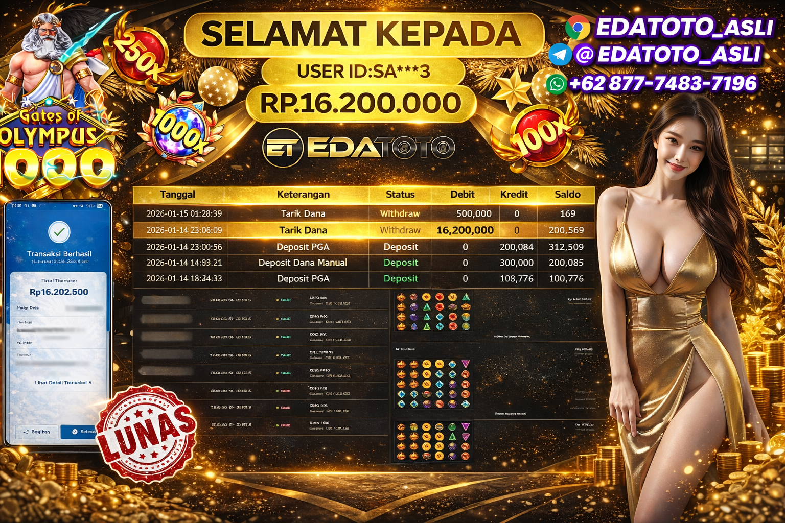 Selamat Kepada Pemilik user ID : SA***3 Hari/Tanggal :rabu/ 14, Januari 2026 Jackpot : Rp. 16,200,000 JT Withdraw : 16,200,000 . . .