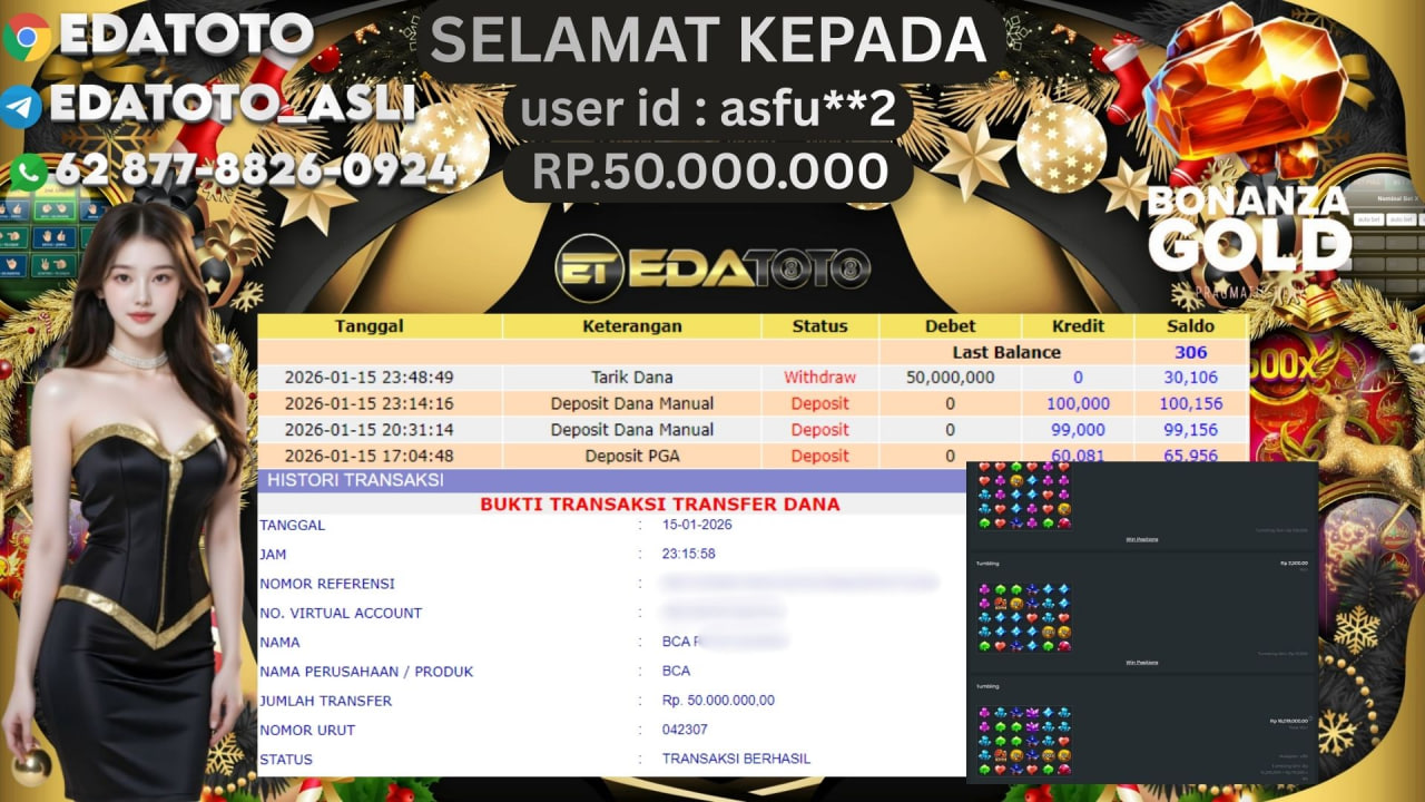 Selamat Kepada Pemilik user ID : ASFU**2 Hari/Tanggal :kamis/ 15, Januari 2026 Jackpot : Rp. 50,000,000 JT Withdraw : 50,000,000 . . .