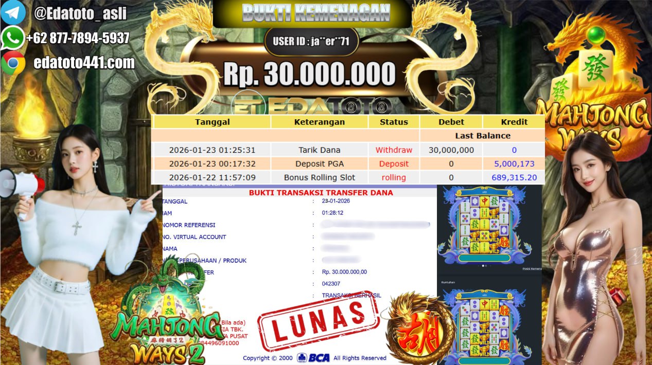 Selamat Kepada Pemilik user ID : ja**er**71 Hari/Tanggal :jumat/ 23, Januari 2026 Jackpot : Rp. 30,000,000 JT Withdraw : 30,000,000 . . .